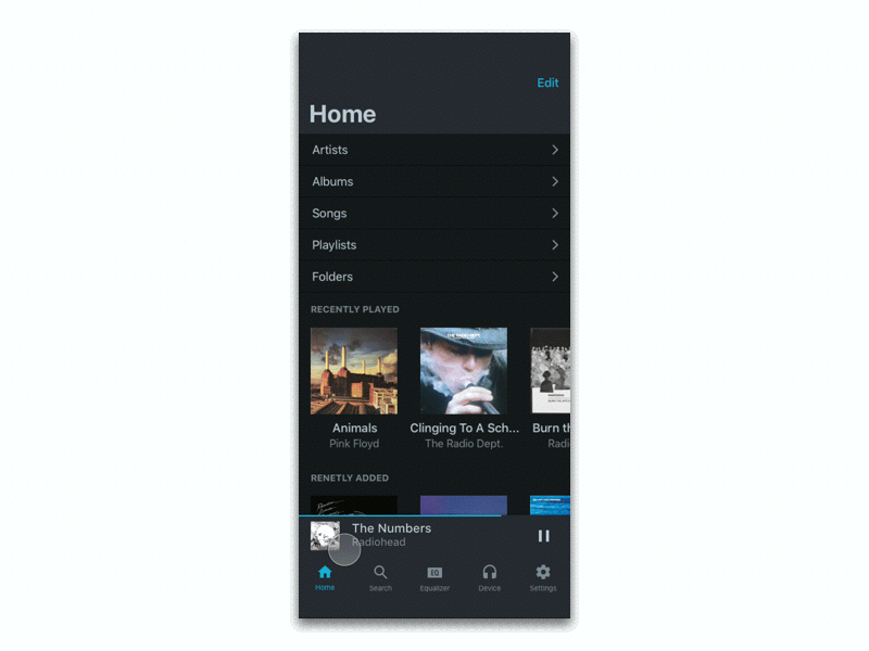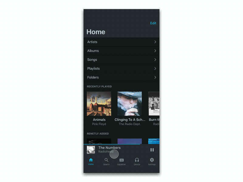The team had limited resources and time to develop the mobile app. We used to have the idea of surfacing the music library and hiding everything in the hamburger menu. The such design required customized styling (The scrollable tab bar) on iOS and it's not a generally adapted pattern on iOS. Moreover, having two separate information architectures for different platforms would make the app hard to scale due to the limited resources we have. In the end, the team decided to utilize OS provided UI pattern to surface UI library, EQ and headphone control at the same level, which is scalable, easier to develop, and meet our business purpose of serving the app as a "listening platform"
